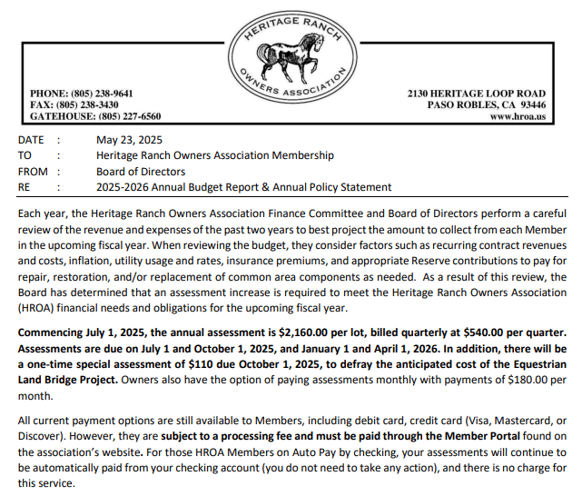 25-26 Annual Budget Letter - Heritage Ranch Owners Association