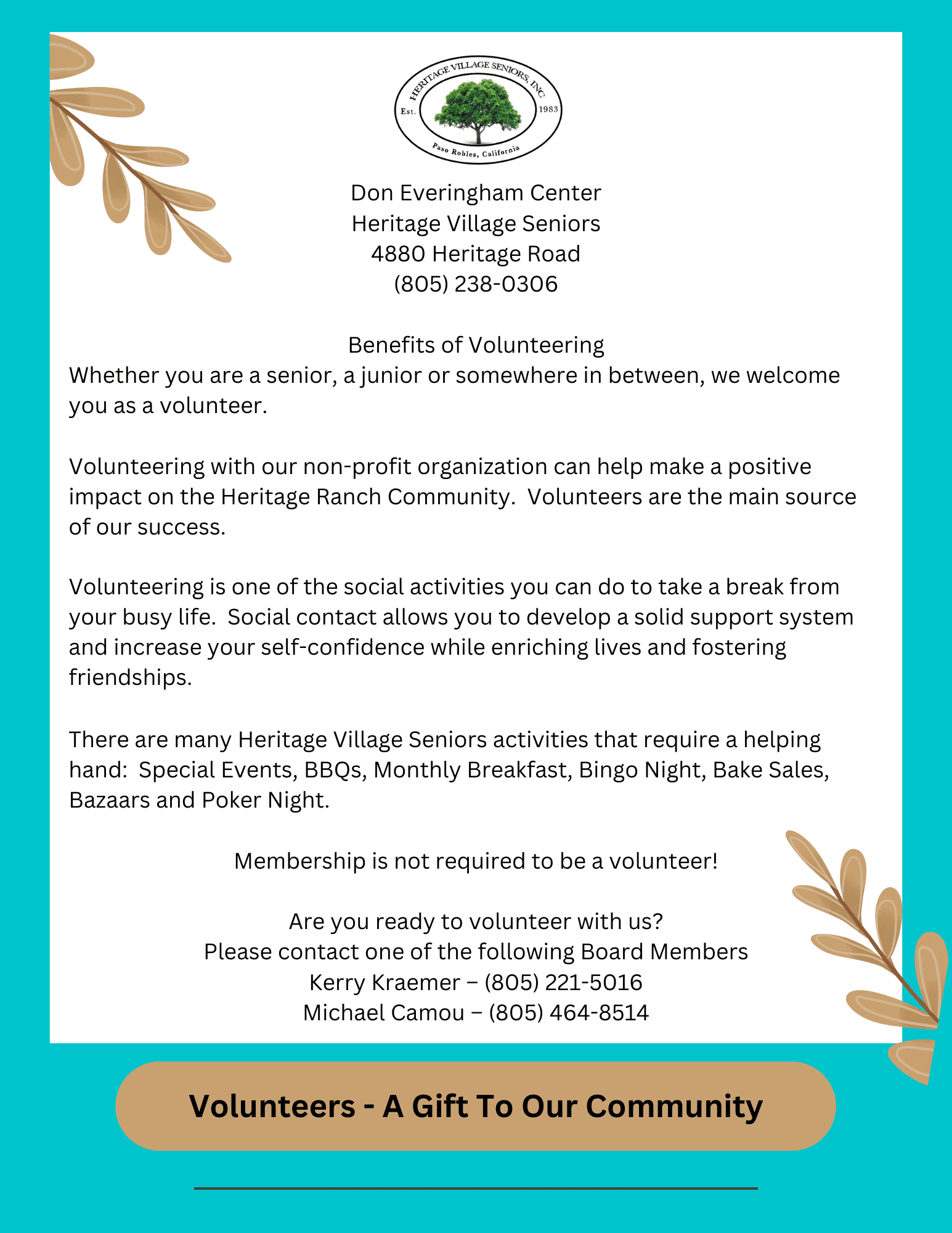 Don Everingham Center for Rent: If you are looking for a perfect place for your next event. Look no further. The Don Everingham Senior Center offers a modern 4200 sq. ft. space including a fully equipped kitchen, Great Room, Game Room, and lighted and screened-in Patio and BBQ area. The facility is available for member and non-member family gatherings and celebrations. For more information and rental rates, call Carol Fieber, Operations Chairperson, at 510-468-4171 or direct message @heritage.village.seniors.inc on Facebook.