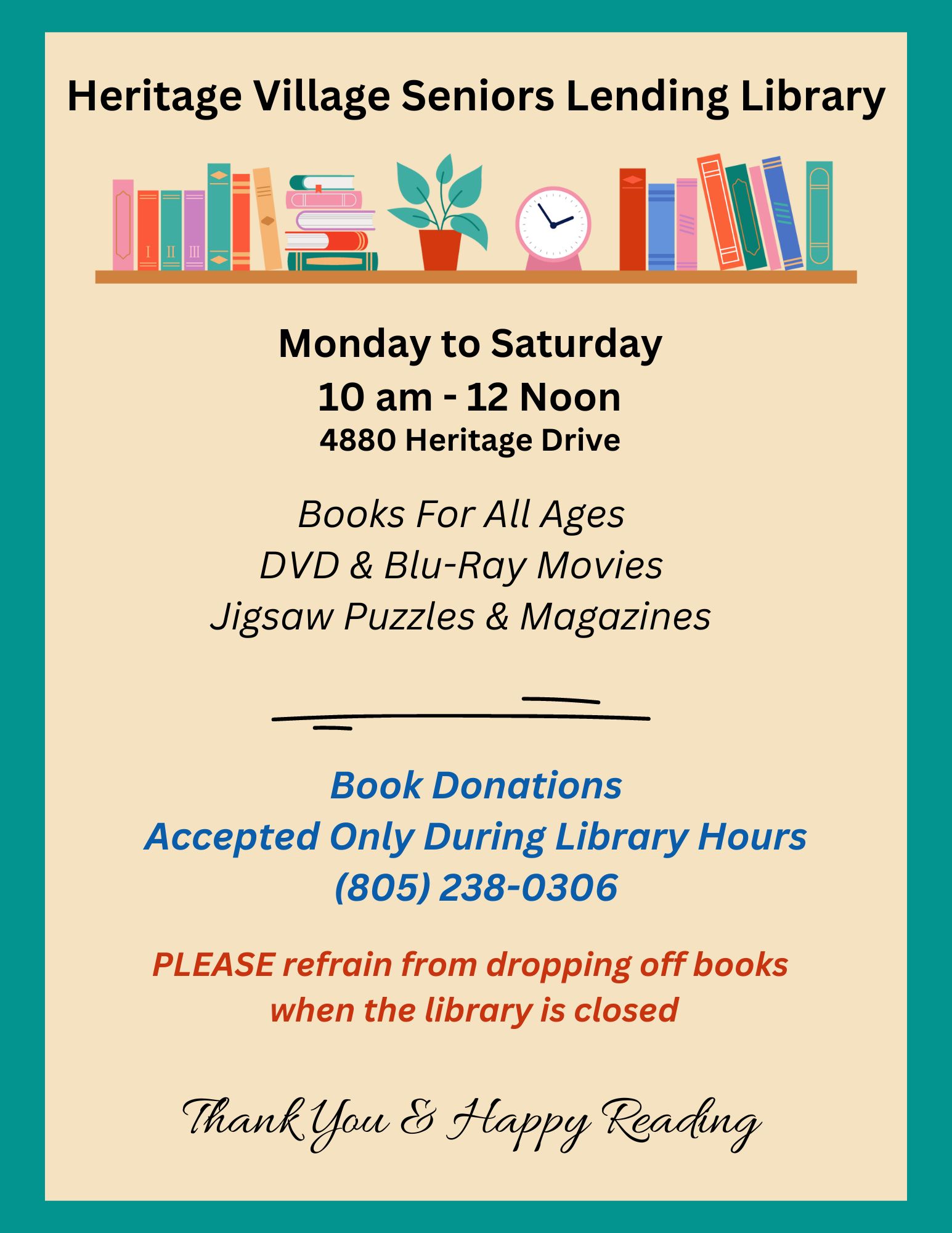 Heritage Village Seniors Book Club: HVS Book Club meets on the 2nd Thursday of the month at 1:00 pm in the game room at the Don Everingham Center. Books will be chosen for their interest to a broad range of people. Members and non-members are invited to participate.