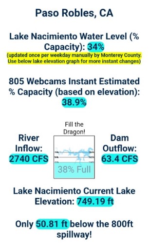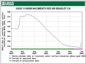 Good evening all, I hope your Christmas and New Year’s were great with family and friends. Attached below is the January 1, 2026, water in/water out for Nacimiento. MCWRA has not updated lake levels since 12/23/25, but it looks like the lake came up close to 6′. Go to USGS 11149300, and you can see what NRWMAC sees. Looks like more rain is on the way. Good job on your rain dances. Happy 2026 New Year!