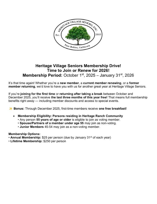 A Meeting of the Board of Directors of Heritage Ranch Owners Association will be held on Wednesday, October 15, 2025, at the Recreation Barn located at 2555 Equestrian Road, Paso Robles, CA 93446. The Special Open Session will begin at approximately 6:00 pm and is open to all Members. Click here to view the agenda.